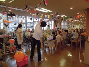 会場の飾りつけはハロウィーンにちなんでコウモリやカボチャを窓に貼ったり、天井から吊るしたりしました。すべての利用者さまに参加確認をして、8割の方にご参加いただきました。開始時の選手宣誓は利用者さまにお任せしました。