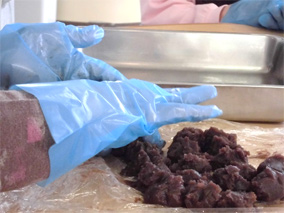お皿の上に生地を敷いて、その上に丸めたあんこをのせます。その際に丸いあんこを押さえて少し平たくして、上に被せる生地をのせやすくします。この作業は利用者さまにしていただきました。