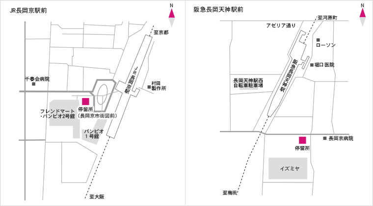 長岡病院→(約6分)→JR長岡京駅西口→(約3分)→阪急長岡天神駅南→(約10分)→長岡病院を循環します。